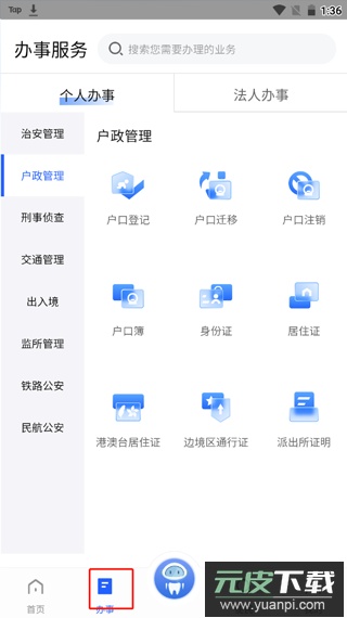 2、点击“办事”栏目,其中提供治安管理、户政业务、刑事侦查、交通管理、出入境服务、监所管理、铁路公安及民航公安等各类办事入口;