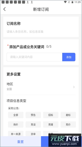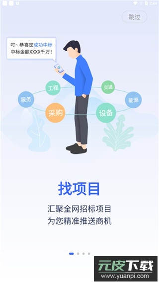 1、打开招标雷达app后,可直接跳过启动时的引导页面,进入软件主界面。
