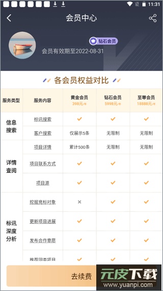 招标雷达的会员体系分为四种类型:黄金会员、铂金会员、钻石会员以及至尊会员;不同会员等级对应的具体权益,可以前往“我的-会员横幅(按钮外部区域)-会员中心”页面进行详细查看。