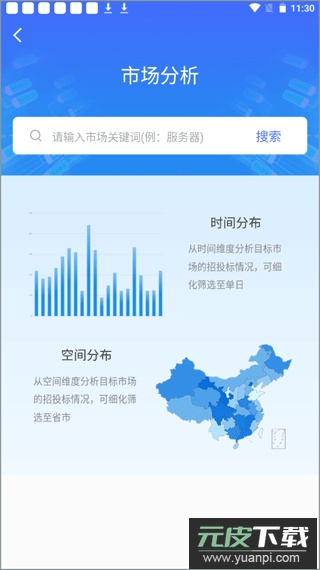 在招标雷达app首页点击【市场分析】功能,输入您想要分析的行业关键词,然后点击【搜索】按钮,系统便会展示该行业在采购与中标方面的时空分布情况。
