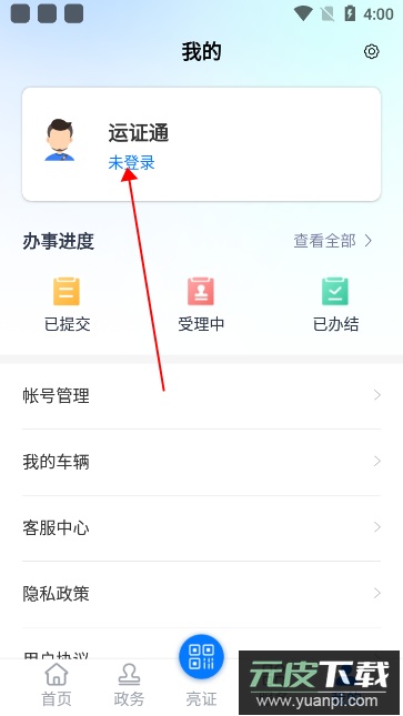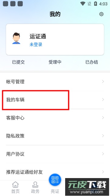 下载并登录运证通应用,在个人页面中找到“我的车辆”入口;