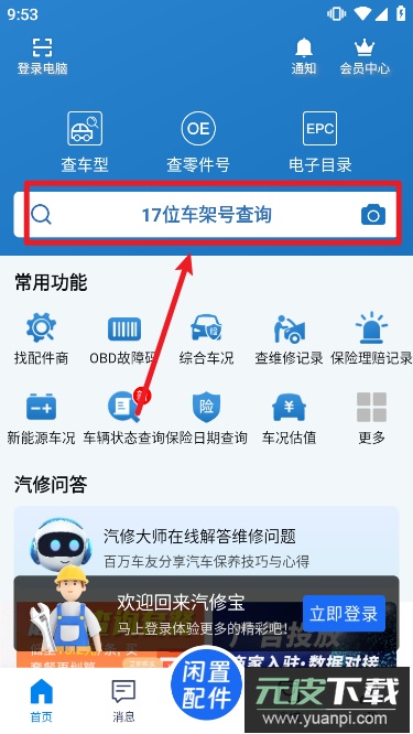 1、首先打开软件进入首页,点击页面上的17位车架号查询入口。