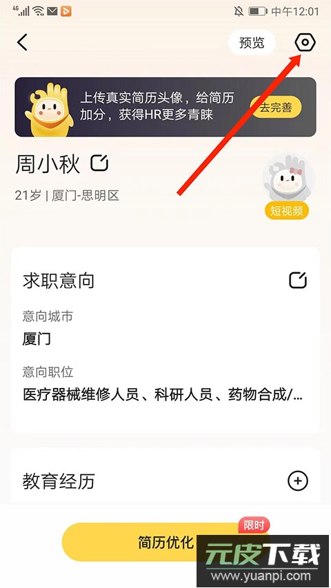3、跳转至简历编辑界面,点击右上角“齿轮”设置图标。