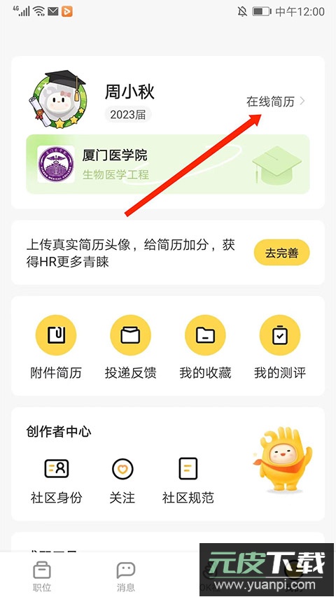 2、进入个人中心页面,点击右上角“在线简历”选项。