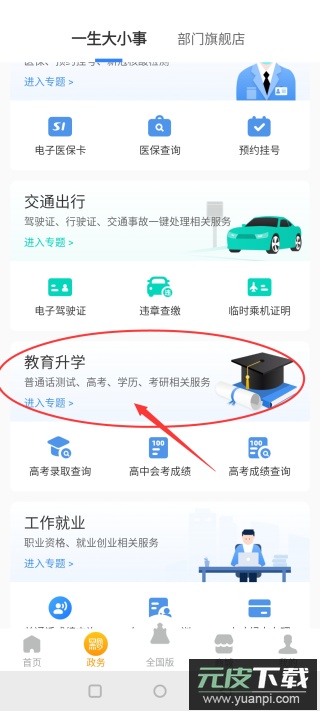 1、进入app政务板块,找到“教育升学”栏目,选择“高中会考成绩查询”功能。
