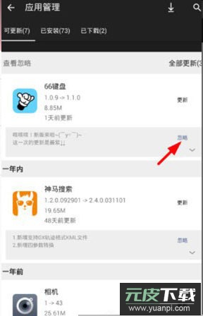 3、选择不希望接收更新提示的应用,点击其右下角的“忽略”选项,此后系统将不再提醒该应用的更新。