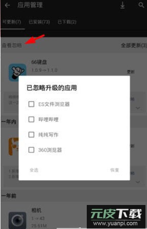 4、已被忽略更新的软件,可以通过“查看忽略”功能进行统一管理和恢复提醒。