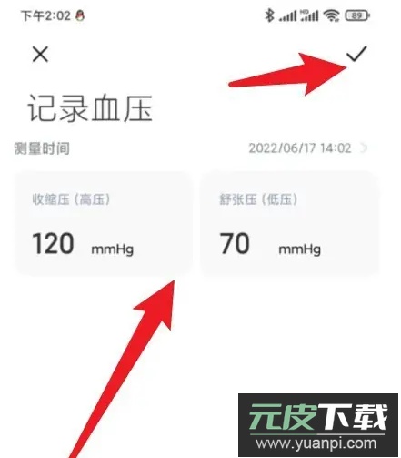 4. 依据实际测量值填写血压数据,点击对勾保存即可。