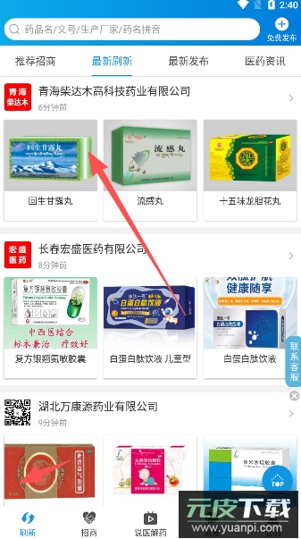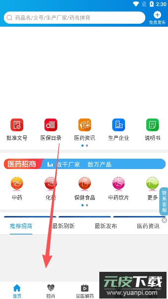 1、药源网的医药招商功能设有独立版块,用户可点击首页右侧栏目进入。
