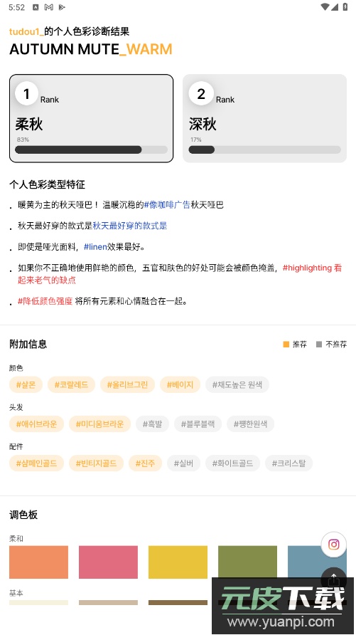 4、查看诊断报告:完成所有检查后,软件会生成个人色彩诊断结果;用户可以下拉页面浏览推荐的颜色、妆容色调、发色及美瞳等个性化建议。