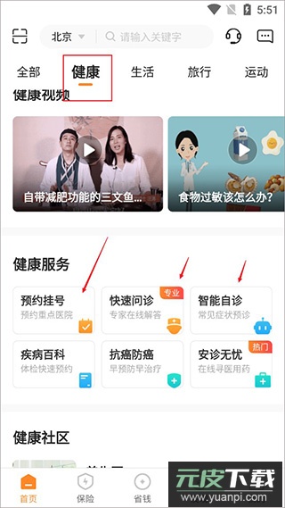 3、遇到健康方面的问题,可以切换到健康板块;该板块提供预约挂号、快速问诊、智能自诊及疾病百科查询等服务;