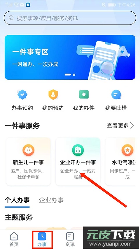 1、登录郑州政务服务网APP,进入办事界面,点击企业开办一件事;