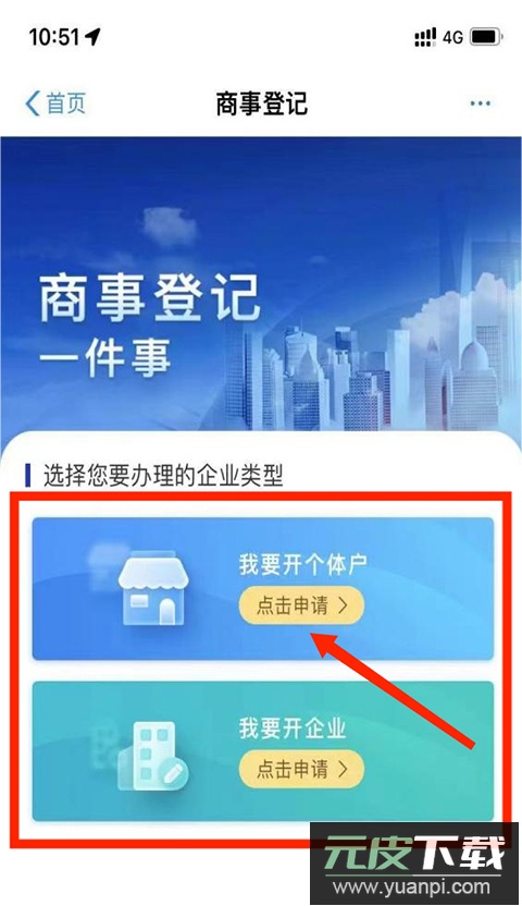 2、在商事登记页面可根据需要选择开办企业或个体户,此处以个体户为例,点击申请按钮;