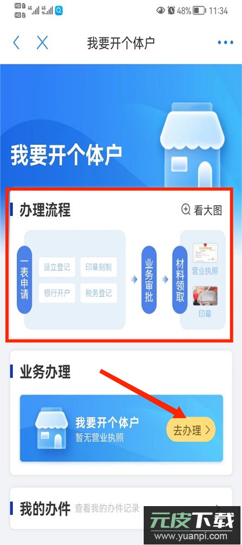3、进入我要开个体户页面,阅读详细流程后点击去办理;