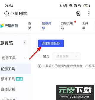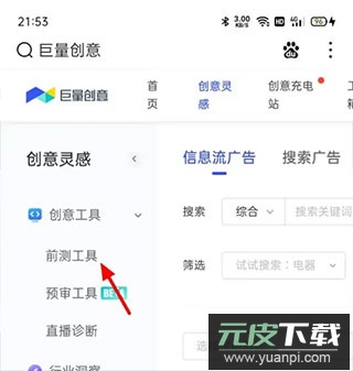 2、在创意灵感页面菜单中,选择“前测工具”功能;