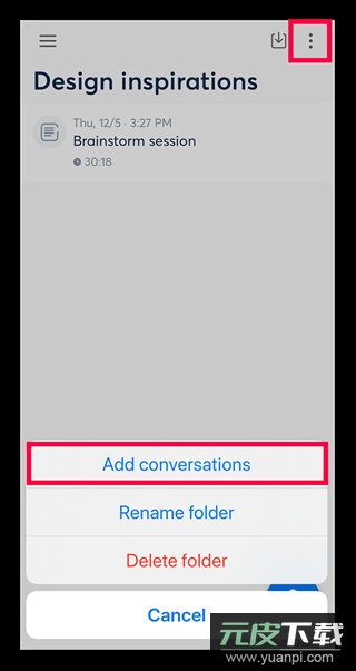 在文件夹界面点击右上角图标,选择“添加对话”菜单;从显示的录音列表中选取需要归类的内容即可。