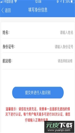 4. 填写姓名、身份证号及航站楼信息,提交后完成人脸识别验证;