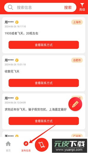 2、点击底部发布信息板块,可浏览大量用户发布的求购资讯与货源详情;
