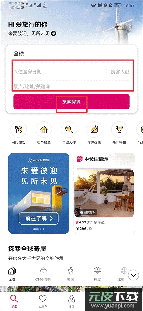 1、打开应用,填写入住与退房日期、出行人数及目的地,开始搜索。