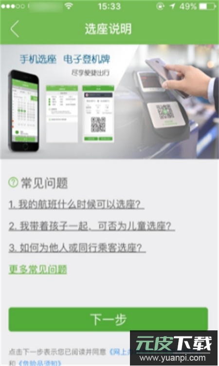 2、页面跳转至“选座说明”,可浏览值机相关常见问题解答,随后点击【下一步】继续。