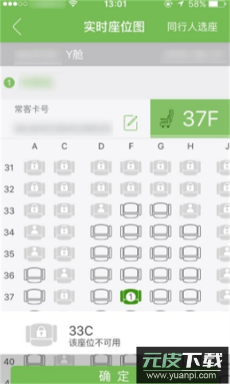 3、进入“实时座位图”界面,在图中点选心仪的座位,被选中的座位将显示为绿色,确认后点击下方【确定】按钮。
