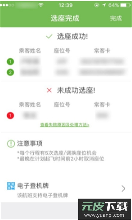 5、最后进入“选座完成”页面,查看结果:若选座成功,点击右上角完成即可;若未成功,可点击页面下方绿色链接查看具体原因与解决方法。