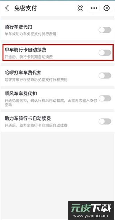 3、将单车骑行卡自动续费右侧的开关按钮关闭,即可完成取消。