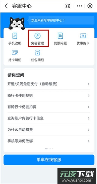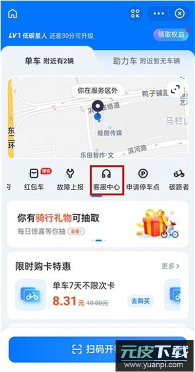 1、在支付宝内搜索哈出行,进入后点击单车栏目,找到客服中心入口。
