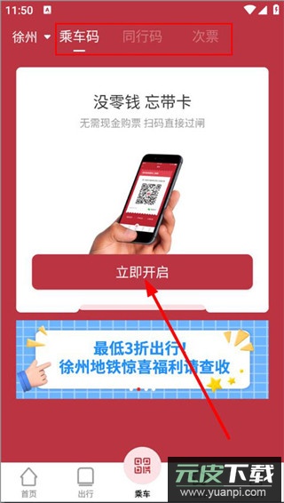 2、进入乘车码界面,可选择乘车码、同行码等类型,点击立即开启;