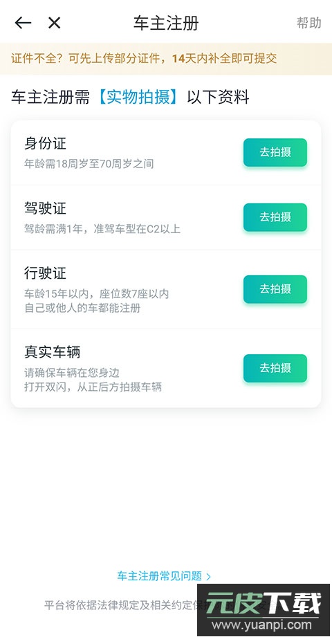 5、按照系统指引依次上传身份证、驾驶证、行驶证及车辆实拍照片,提交全部资料后等待审核,通过后即可正式成为平台车主。