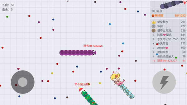 3、游戏并非只以体型论胜负,哪怕刚出生的小蛇,只要技巧足够迫使大蛇陷入绝路,也能将其击败化为光点,这就是所谓的击杀环节;心理素质在游戏中至关重要,保持冷静、避免误判,即使不能每次都夺冠,也常能稳居前列。