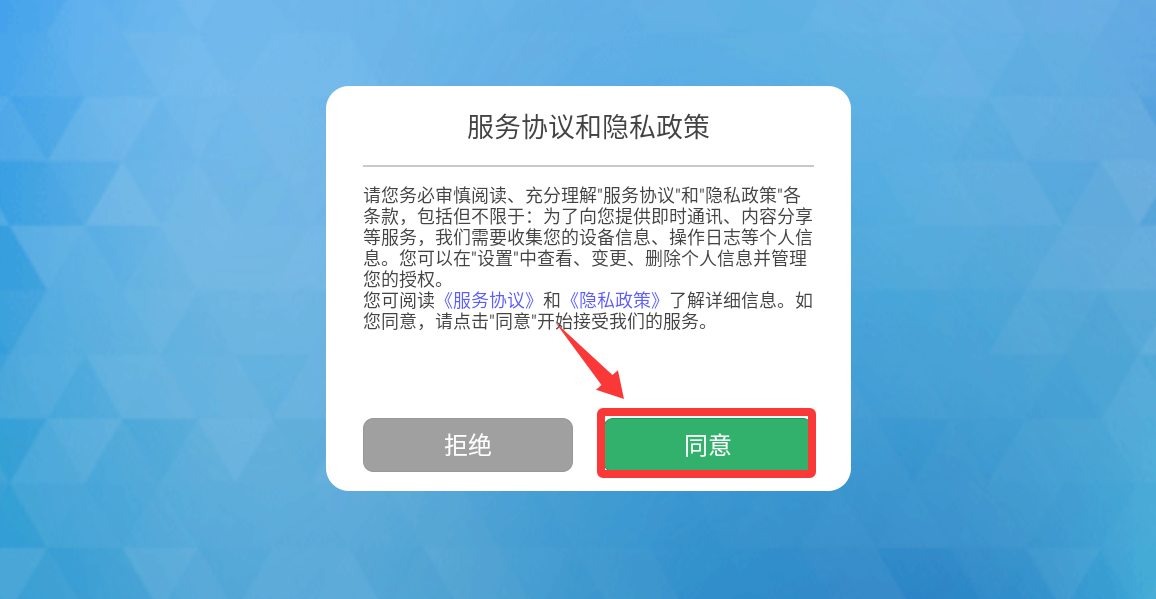 1、首先在服务协议与隐私政策页面点击同意并进入。