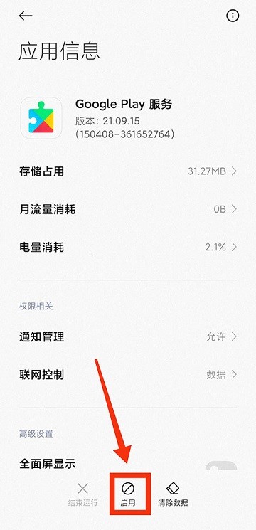 2、此时会快速定位到系统自带的Google Play服务页面,再点击下方的【启用】按钮;