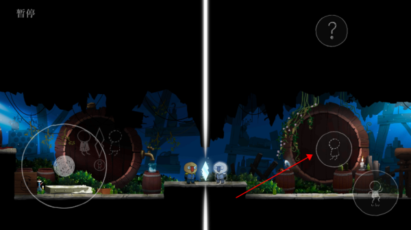 5、当遇到需要前往另一侧的场景时,点击画面中箭头所指的交换图标,即可让本体与分身互换位置。