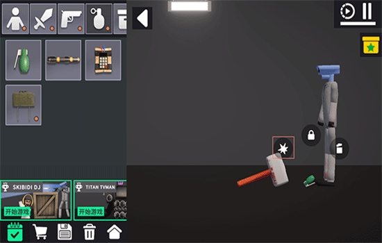 2、任选一种模式进入,可自由添加人物与障碍物,拖动道具进行互动攻击,过程轻松解压。