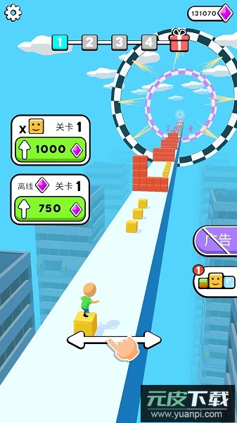 操控角色踩着各种颜色的方块向前滑行时,前方会出现各种各样的障碍物,想要顺利通过的话你就必须保持一定的堆叠高度;