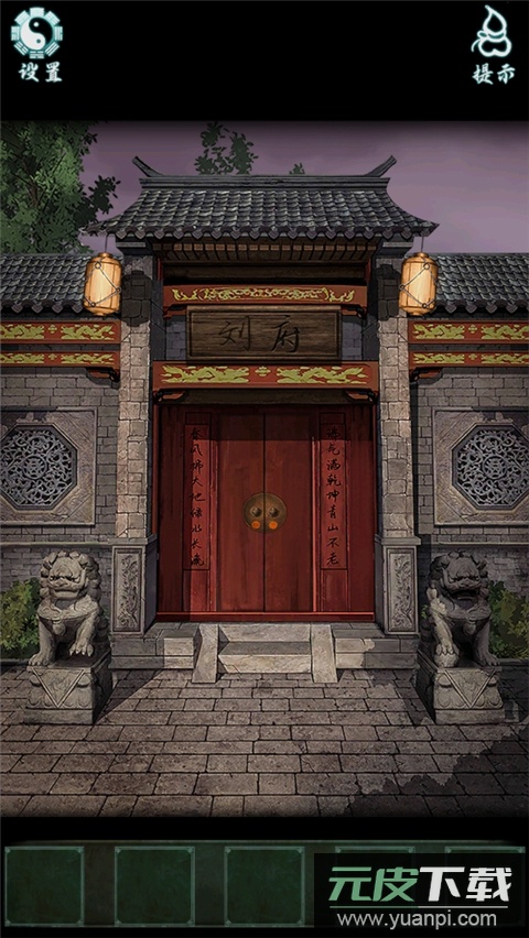 9、来到大门口,将青花瓷球放入左侧石狮的爪下获得钥匙,打开被烧画作后的柜子,取得正屋钥匙与一幅画。