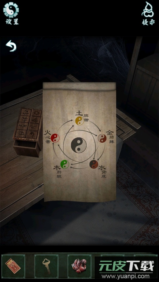 4、查看桌面上的纸条获取提示,按要求摆放五脏纸扎的位置;随后点击书本,得到符汇泉符与一条重要提示。