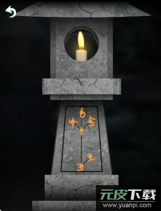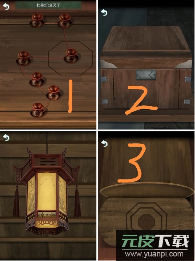 11、回到院子点燃石灯,根据石灯亮起的顺序点击正屋内箱子的密码锁,获得灯笼。