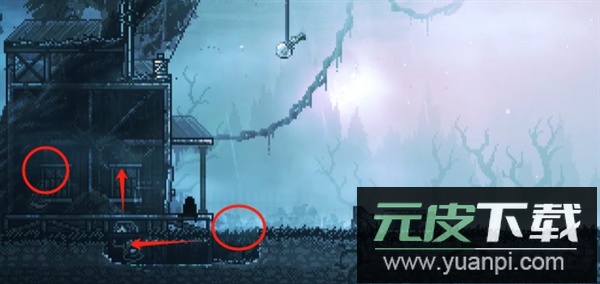 15、遭遇怪物后快速返回下图位置,待怪物跳过右侧,立即爬左方梯子向左奔跑;到达左端后向上攀爬,至最高层再向右跑,直到怪物坠入尖刺坑中。