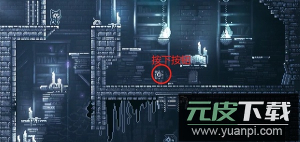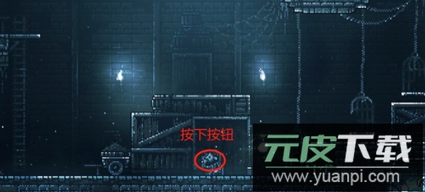 7、回到流浪者视角。按下黑色怪物左侧的按钮,三个铁笼升起,沿铁笼向右移动,爬上最右侧的梯子。