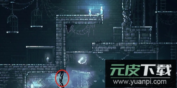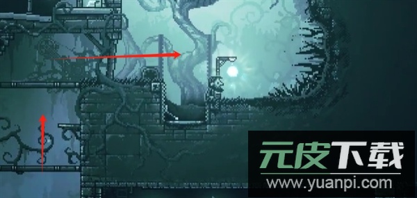 4、向右前进,砍断拦路的藤蔓,继续向右进入城堡,朝着右下的火盆方向下行。