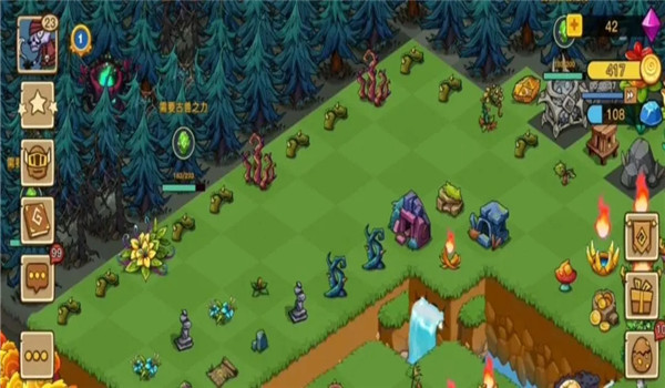 此外,游戏中还存在一些效果强大的道具,例如魔法圣坛、地精洞穴与枯草;魔法圣坛可用于净化解锁土地,并产出魔法结晶;地精洞穴能够生产宝石碎片与金币,同时有机会获得免费宝箱与蛮荒宝箱;枯草则主要用于采集净化树种子。