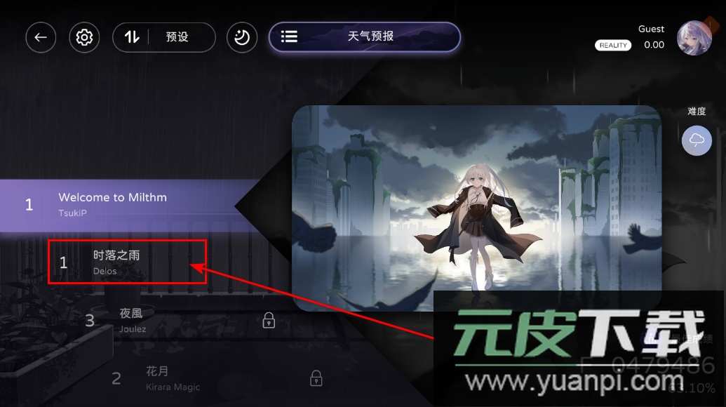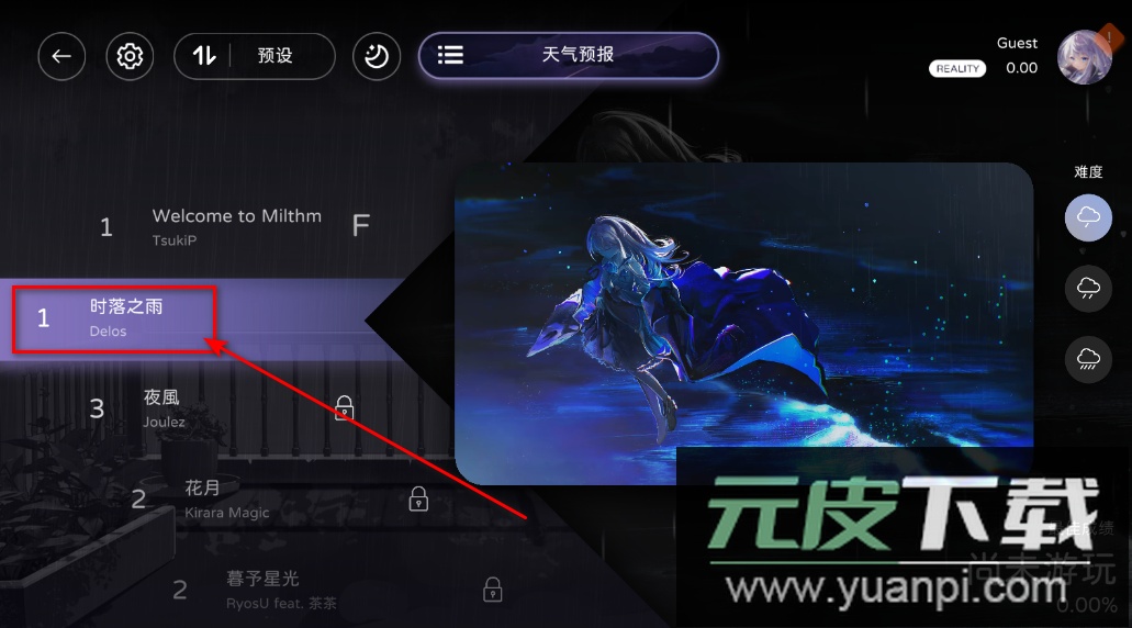 1、进入游戏跳过开场动画,即可看到主界面;左上角显示当前时间,右上角为玩家ID、Reality值与星星数量;左下角是设置入口,右下角可浏览全部乐曲。