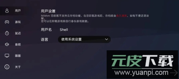 在此可以修改用户名与语言选项,当前版本支持中文、繁体中文、英文及日语;请注意游戏暂无云存档功能,卸载将导致存档丢失,请谨慎操作。