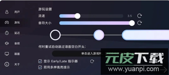 可调整音符流速、大小及重试方式,另提供指示器与多押提示选项;建议多次尝试流速与大小配置,找到最适合自己的手感。