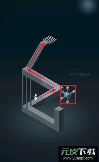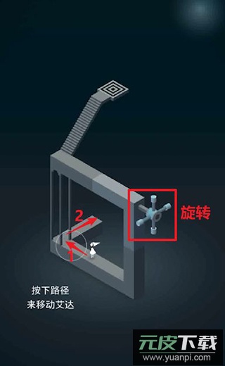 5、先旋转旋钮让艾达走上台阶,转动阶梯使她进入通道;再次旋转让艾达踩到机关。艾达返回通道后继续旋转,使她走到被触发机关上方的通道;艾达沿通道前行,再次旋转将她引至门前。
