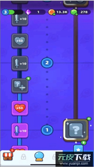 1、玩家操控小球持续发射弹射物攻击敌人,在过程中可收集金币与各类道具。
