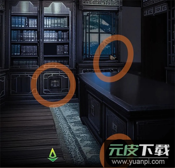 拾取地上的木偶,获取窗台上的木鸟;点击书柜下的天平图案,放入砝码。