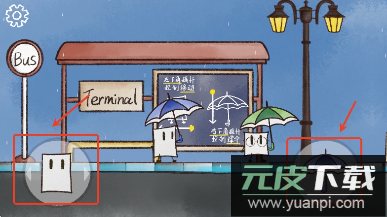玩家使用左侧虚拟摇杆控制纸片人移动;右侧摇杆则用于操控雨伞的方向与角度。